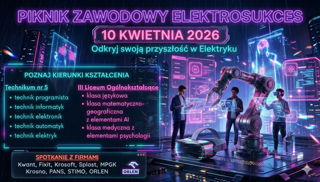 Serdecznie zapraszamy uczniów klas ósmych szkół podstawowych na Piknik Zawodowy „Elektrosukces”, który odbędzie się 10 kwietnia 2026 roku w Zespole Szkół Elektrycznych i Ogólnokształcących w Krośnie przy ul. Rzeszowskiej 10.